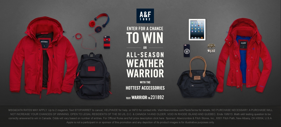A&F is giving away roughly US$930 worth of merchandise to two lucky winners for simply applying online or by text message. Now, that is almost $2000 worth of merchandise. Personally I see that as "grasping at straws." It's a particularly expensive contest that I don't see helping much. Although, I did still sign up for it. What the heck, right?